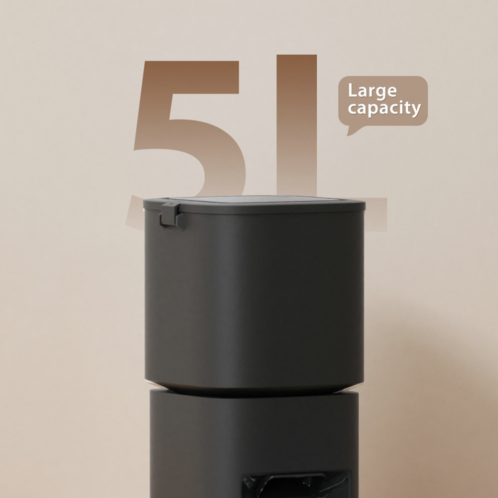 A: It features a 5L capacity with an anti-jam, sealed design.